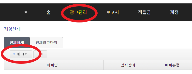 3. 회원가입 후 상단 2번째 광고관리에서 +새매체를 클릭합니다.
