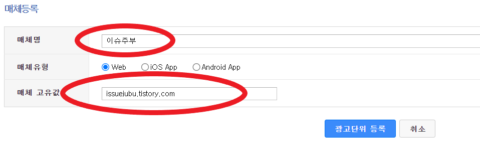 4. 광고관리에서 매체명인 이슈주부와 매체고유값인 티스토리 주소를 입력해야 홈페이지 검토가 가능합니다.