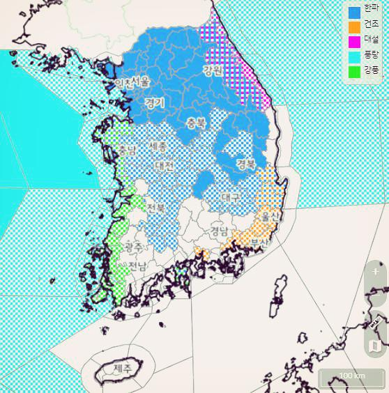 아래 지도의 파란색 부분이 한파를 나타내고 24일 밤 9시부터 시행된다네요.
