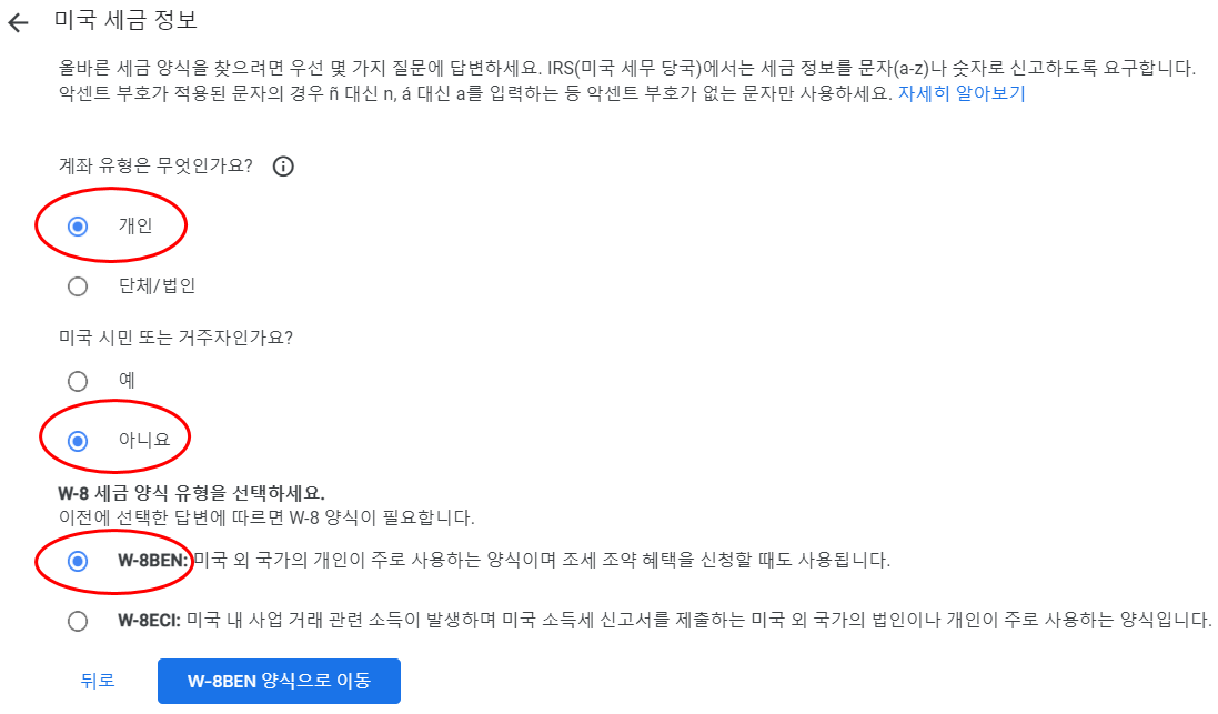 그리고 미국 내 사업 거래가 아니면 W-8BEN을 선택합니다.