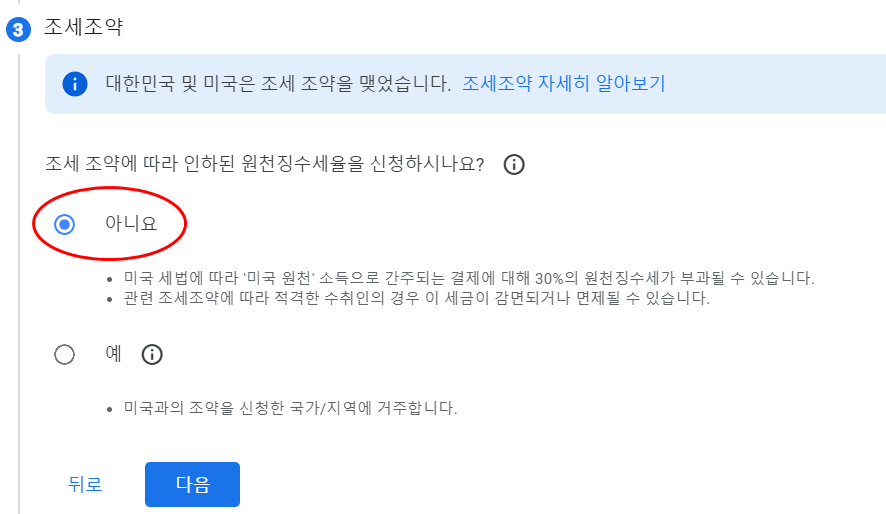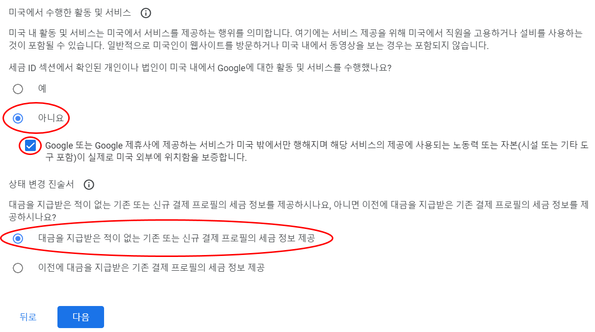 미국 내에서 Google 활동 및 서비스를 한 적이 없다면 아니요에 체크합니다.