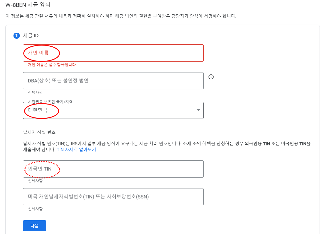 대한민국은 미국과 조세 조약 혜택이 있기에 TIN번호를 기입하면 수익의 10%만 제외하고 입금됩니다.