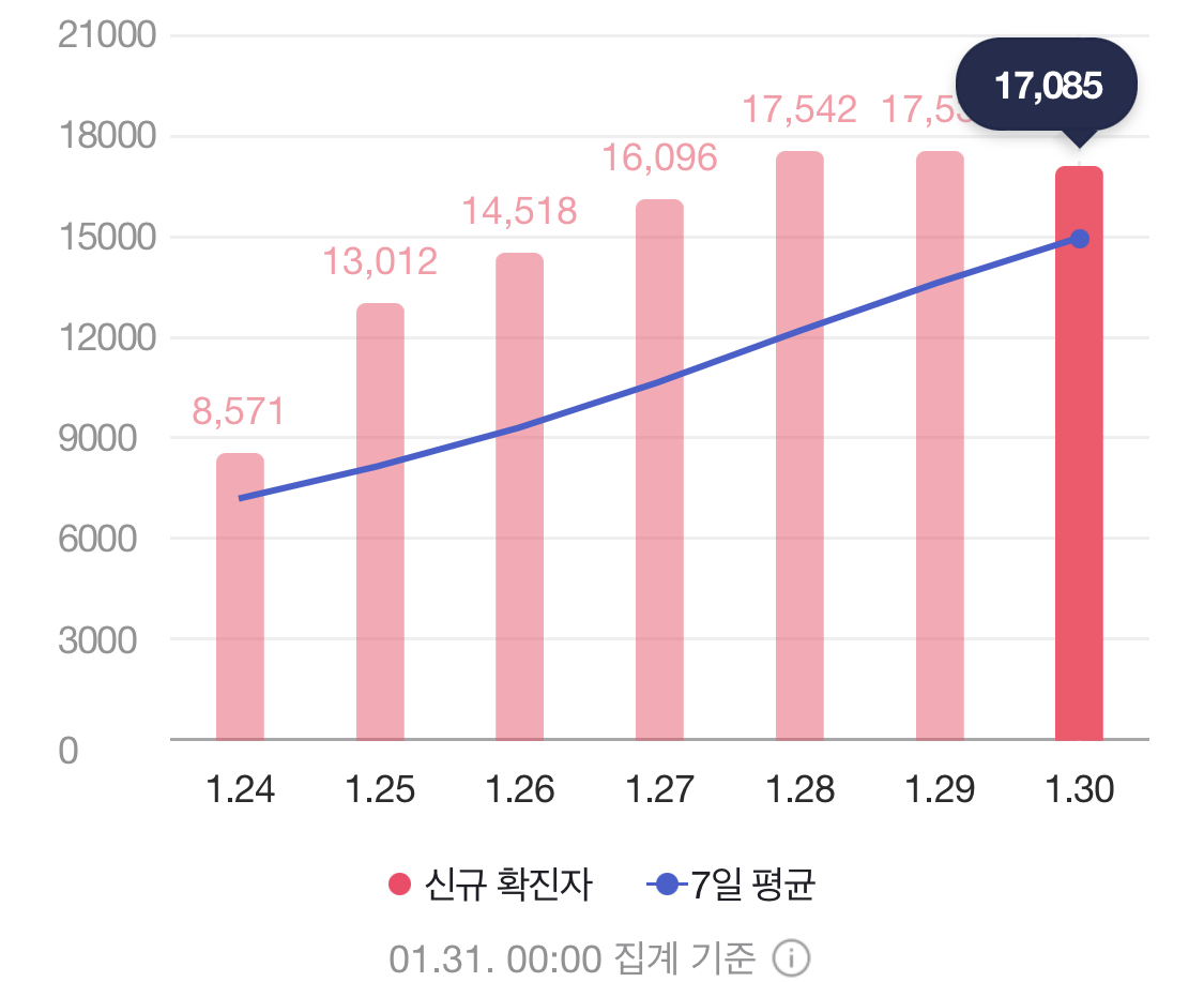 2월 1일 0시 기준 신규 확진자 수는 17,085명입니다.