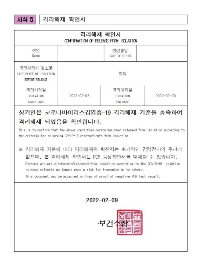 아들 앞으로 온 격리해제 확인서입니다.