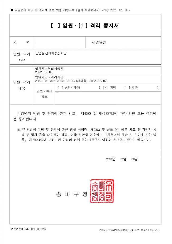 저와 막내에게 입원·격리 통지서가 문자로 왔습니다.