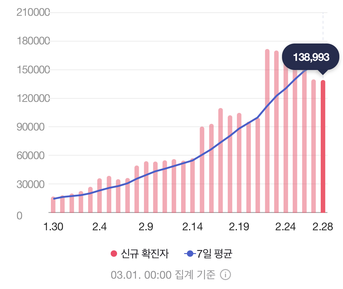 3월 1일 0시 기준 신규 확진자 수는 138,993명입니다.