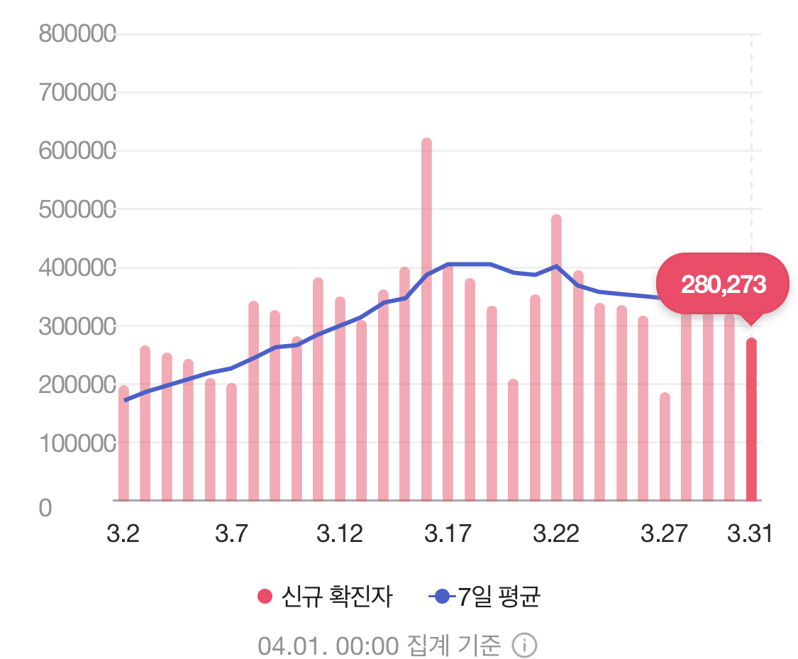 4월 1일 0시 기준 신규 확진자 수는 280,273명입니다.