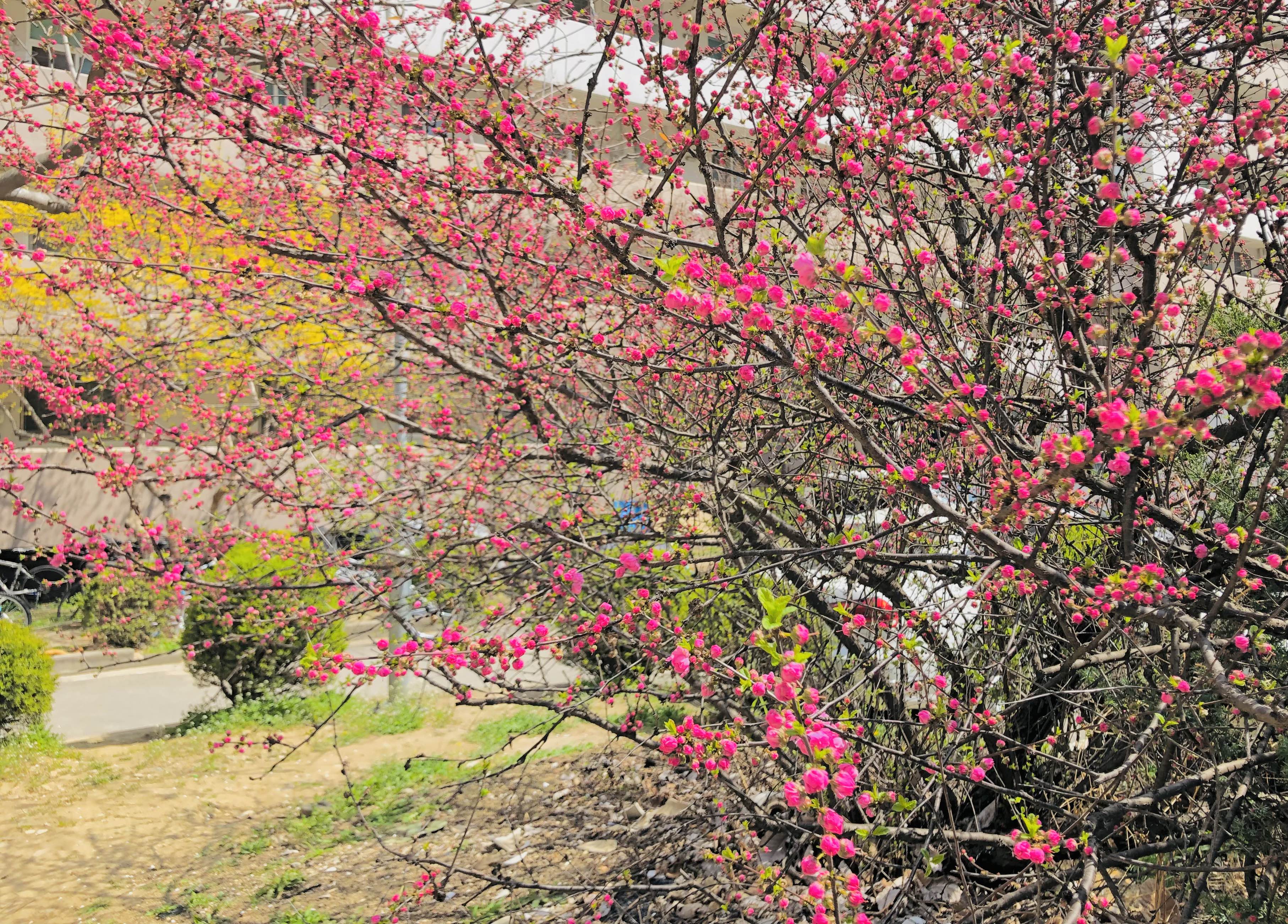 앵두꽃과 개나리의 색 조합이 봄 한 가운데에 있음을 알게 해주네요.