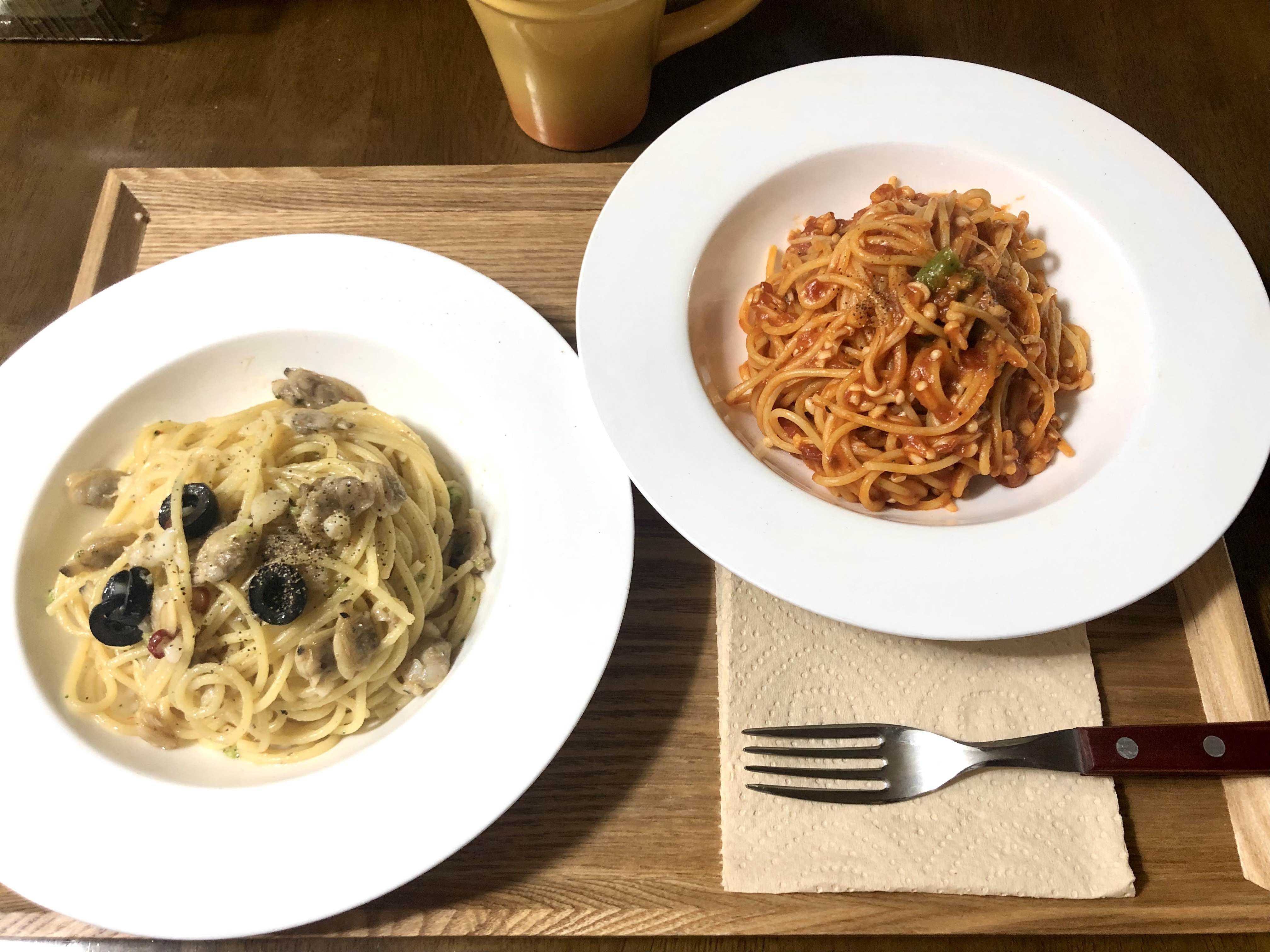 막내가 요리한 알리오 올리오와 토마토소스 스파게티입니다.