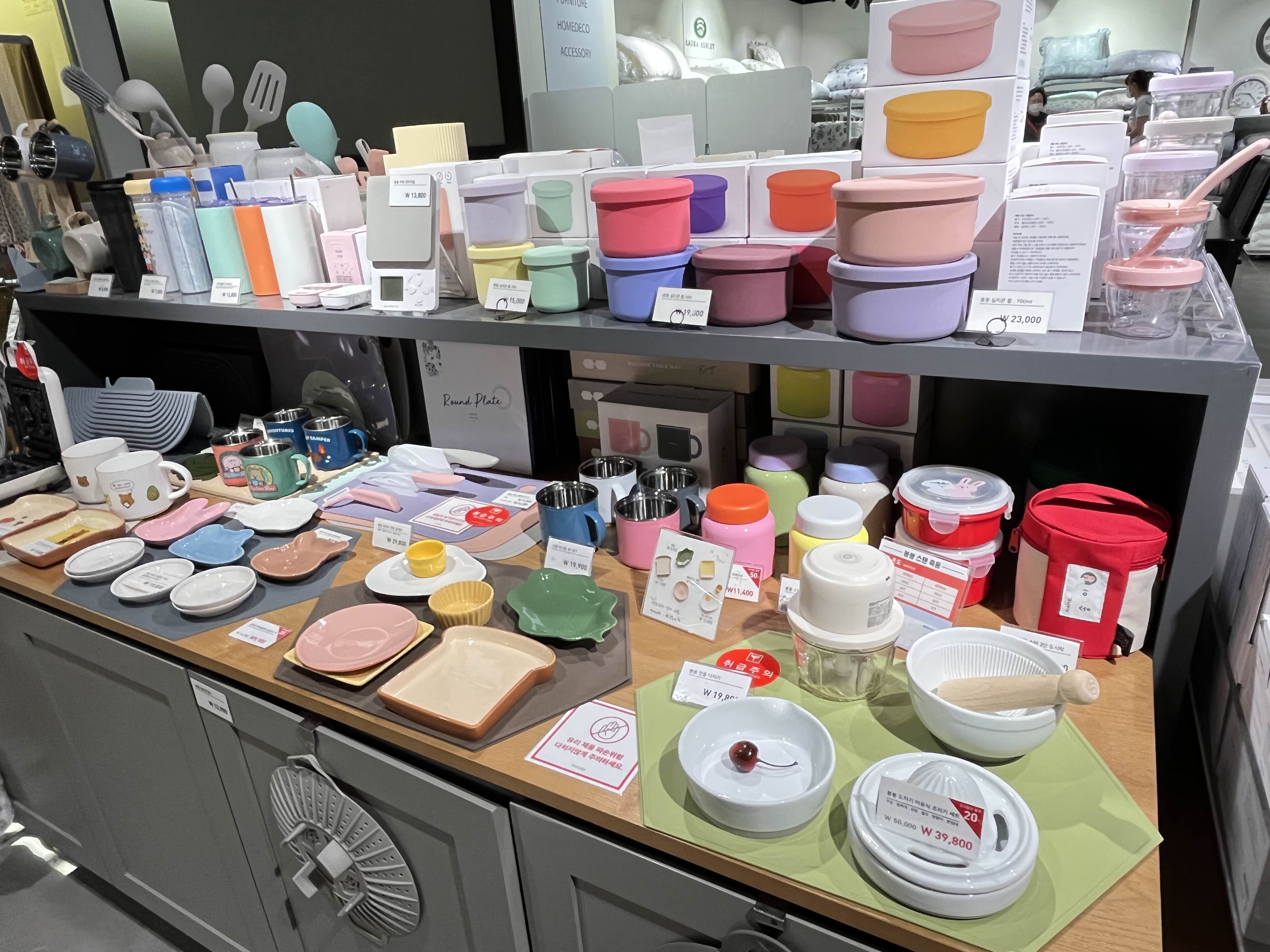 원단이 사용되는 가방, 양말 등 생활소품과 주방용품이 진열되어 있었습니다.