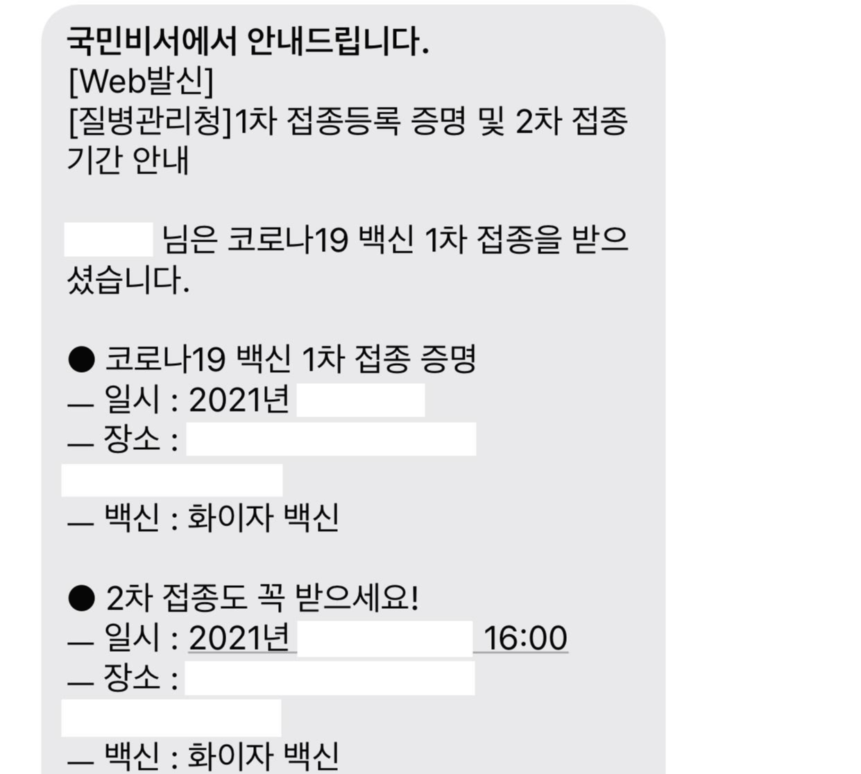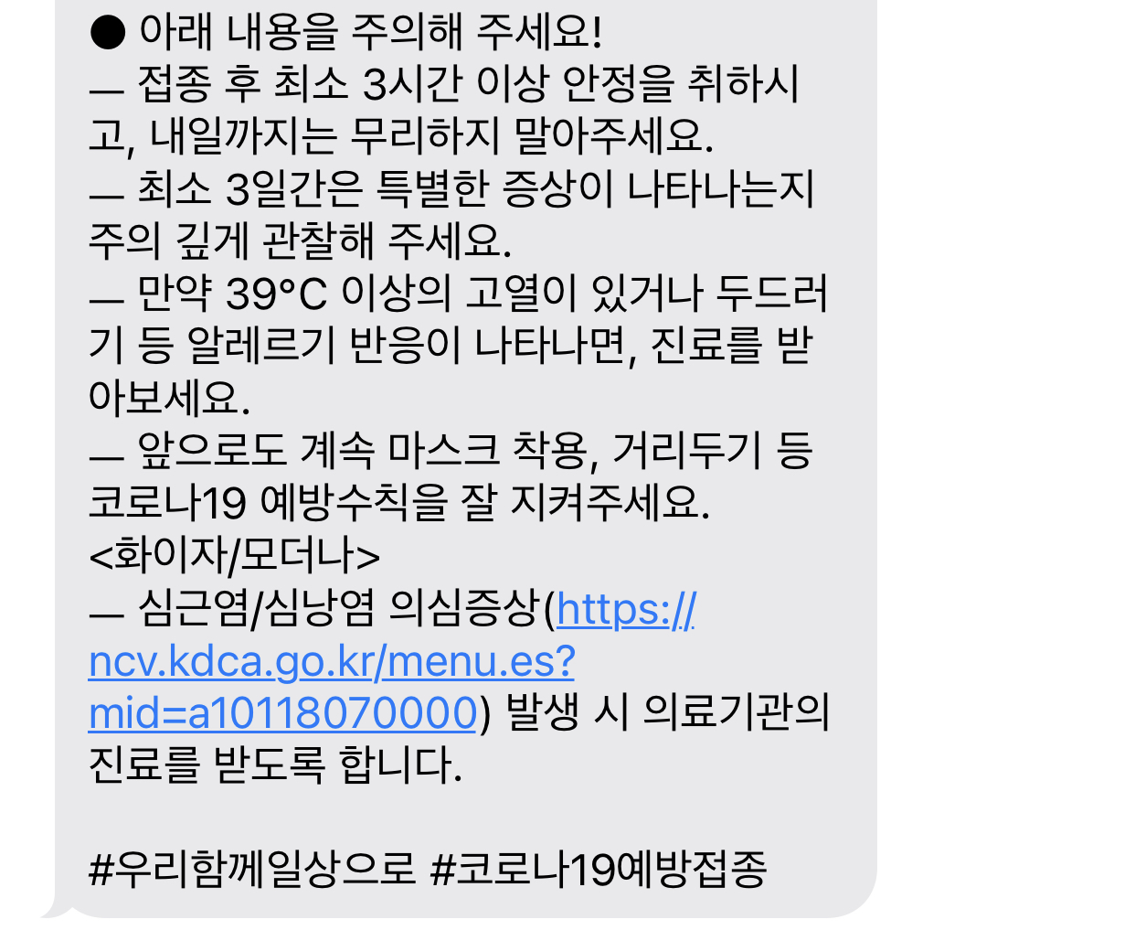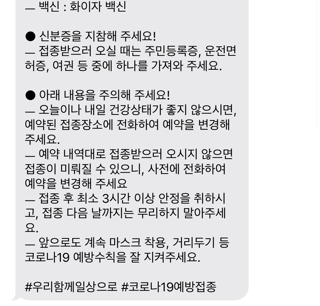 접종 하루 전날, 아래와 같은 문자를 받는답니다.