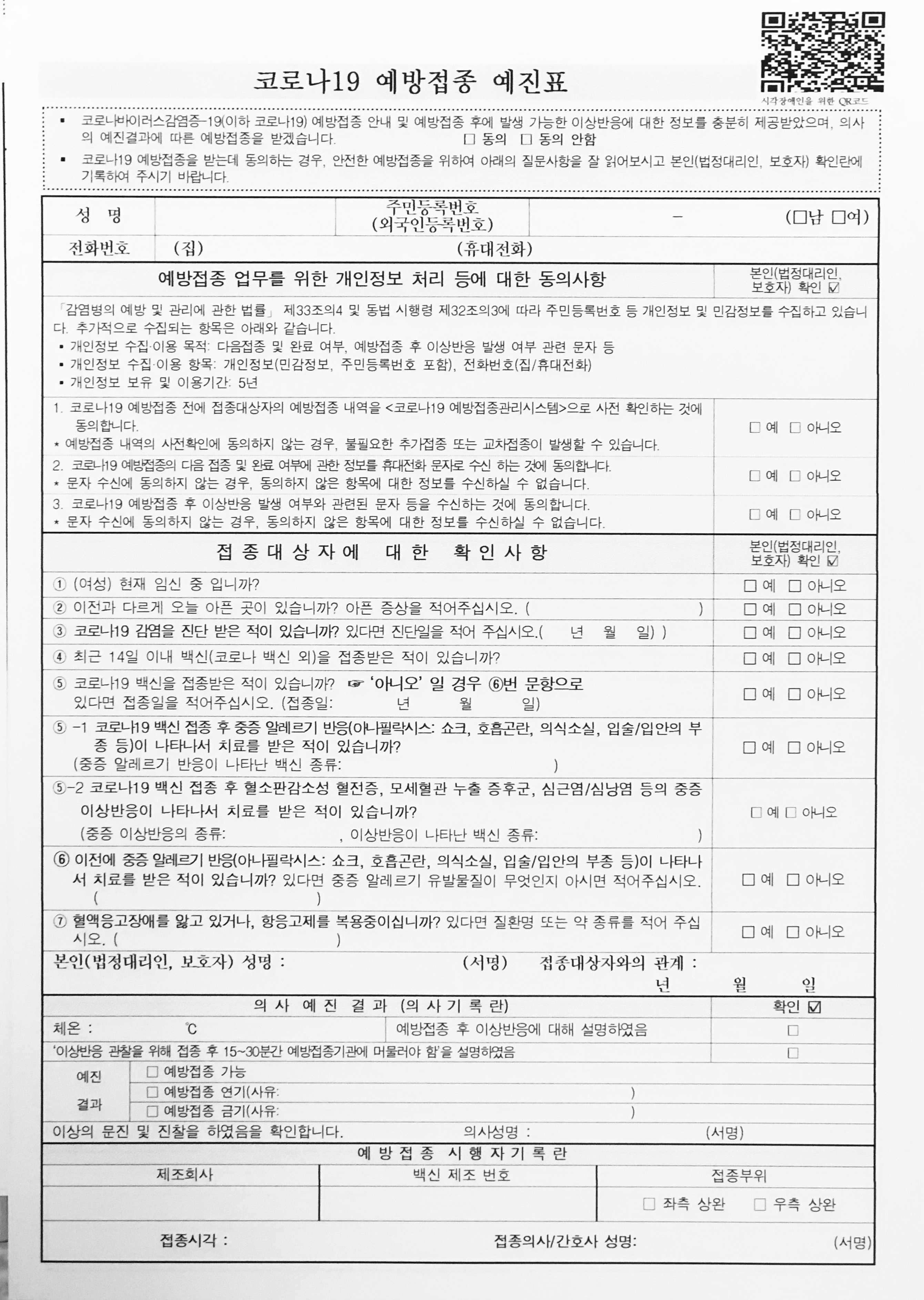 아래의 코로나 19 예방접종 예진표 작성하고 병원 입장~