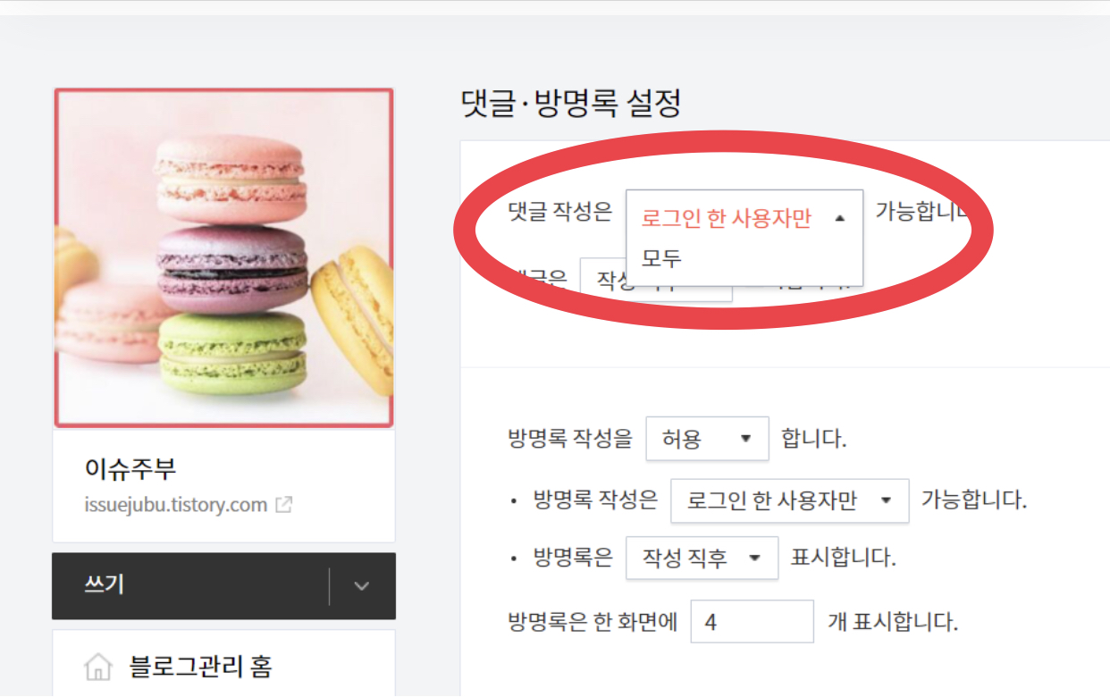 우측에서 '댓글 작성은 로그인 한 사용자만 가능합니다'로 변경합니다.