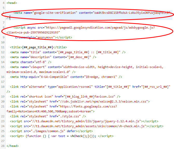 <head>와 </head> 사이에 애드센스와 구글서치콘솔에서 발급받은 태그 입력 위치를 변경하였습니다.