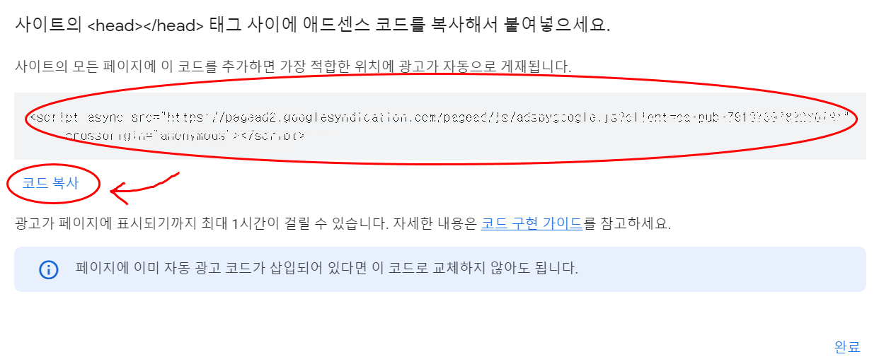 중요한 것은 <head>와 </head> 사이에 애드센스 사이트에서 복사한 태그를 붙여 넣기 하는 것입니다.