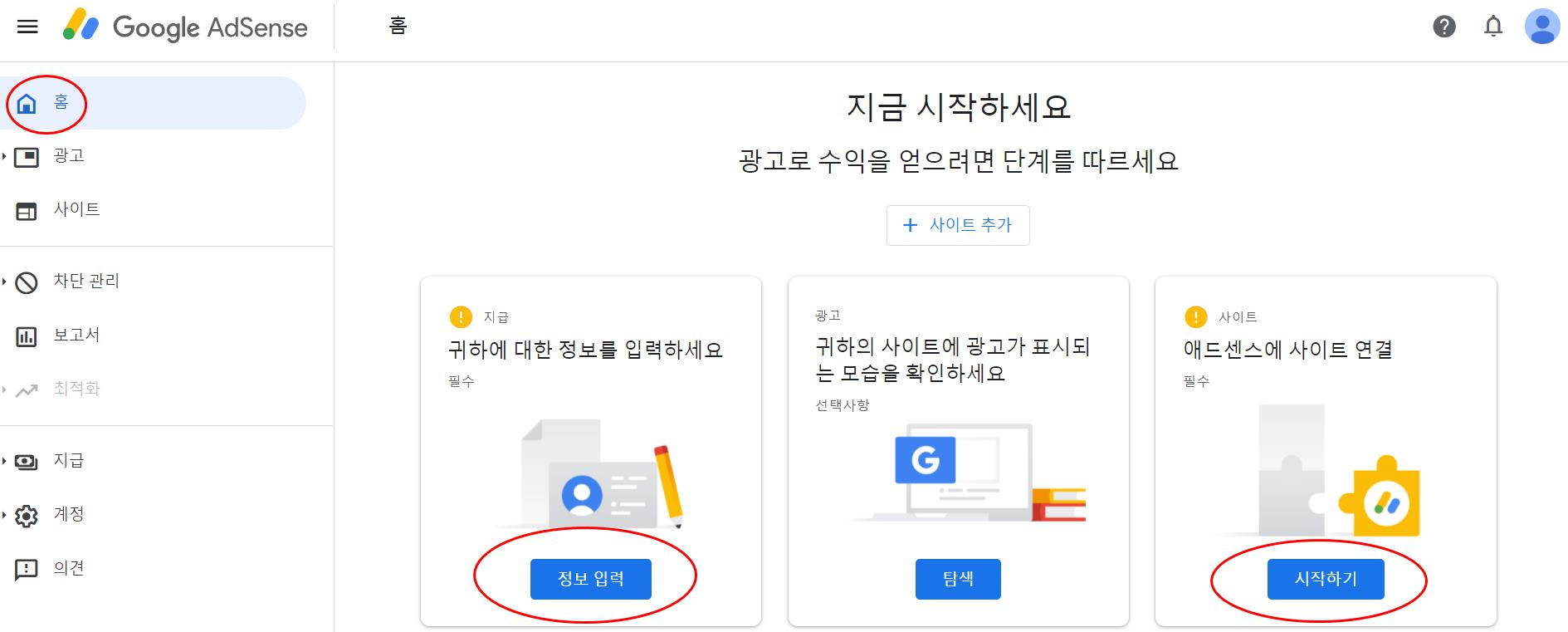 구글 애드센스(Google AdSense) 홈 화면 모습입니다.